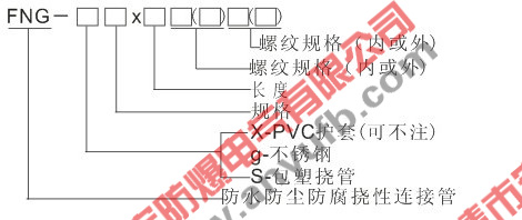 ◆若需訂購防爆撓性連接管,材料為PVC、管通徑為15mm、長度為500mm,一端內(nèi)螺紋一端外螺紋、螺紋規(guī)格為G1/2",則訂貨型號為“NGd-15×500B”;